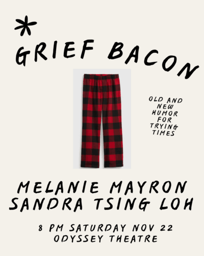 Melanie Mayron (Thirtysomething) and Sandra Tsing Loh (NPR) share old and new humor for the holidays. Grief Bacon comes from the German “kummerspeck,” aka: “weight gain from emotional overeating.” A quick evening of (much-needed) amusement and yes, if the world’s just all too much, you can wear your pajamas.
